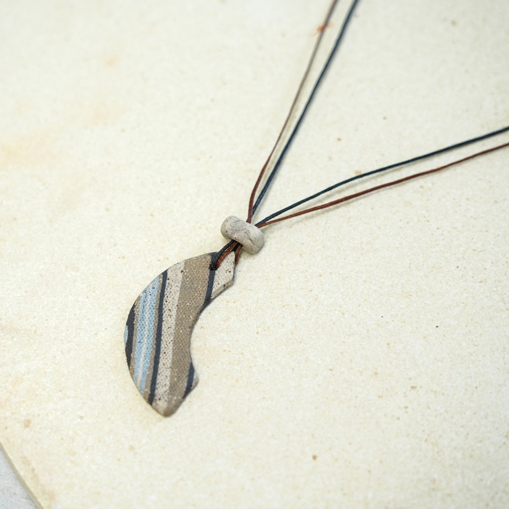 This waxthread necklace features an asymmetrical ceramic element with a softly curved silhouette and layered striped detailing in muted beige, blue and charcoal tones. The ceramic form resembles a natural fragment shaped over time, creating a balanced yet dynamic visual presence. Fine waxed threads pass through a small ceramic spacer, offering lightness and flexibility. Each necklace is handcrafted and entirely unique.
