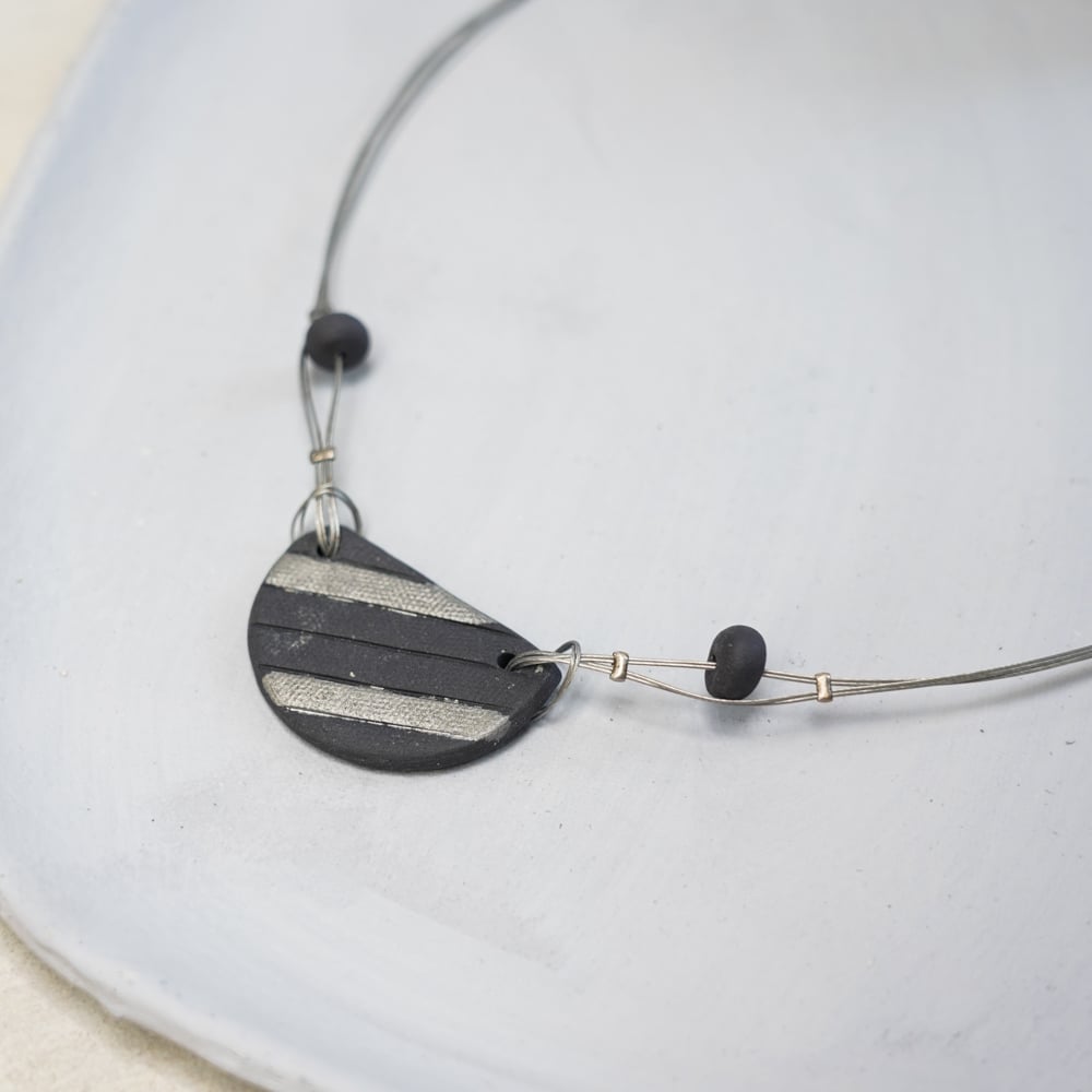 This wire necklace features a round matte black ceramic disc decorated with subtle silver linear accents. The horizontal lines create a refined contrast against the dark ceramic surface, adding visual rhythm while preserving a clean, contemporary aesthetic. Its lightweight construction allows the necklace to rest naturally on the neckline for comfortable everyday wear.