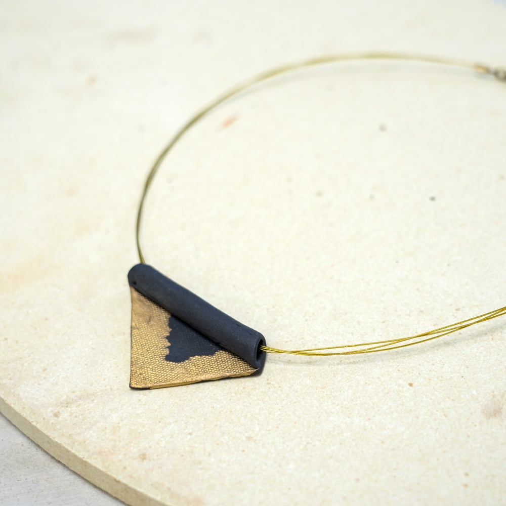 The ceramic triangle is shaped and kiln-fired by hand. The gold-toned texture is applied manually, creating natural surface variations that make every necklace one of a kind while preserving visual coherence.