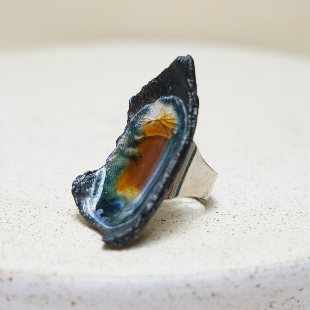 This ring functions as a bold statement piece and pairs effortlessly with neutral outfits, denim, linen, or minimal monochrome looks. At the same time, the contrast between the deep blue ceramic edge and the warm amber glass centre makes it suitable for everyday wear. As a result, it also works beautifully for more artistic styling.