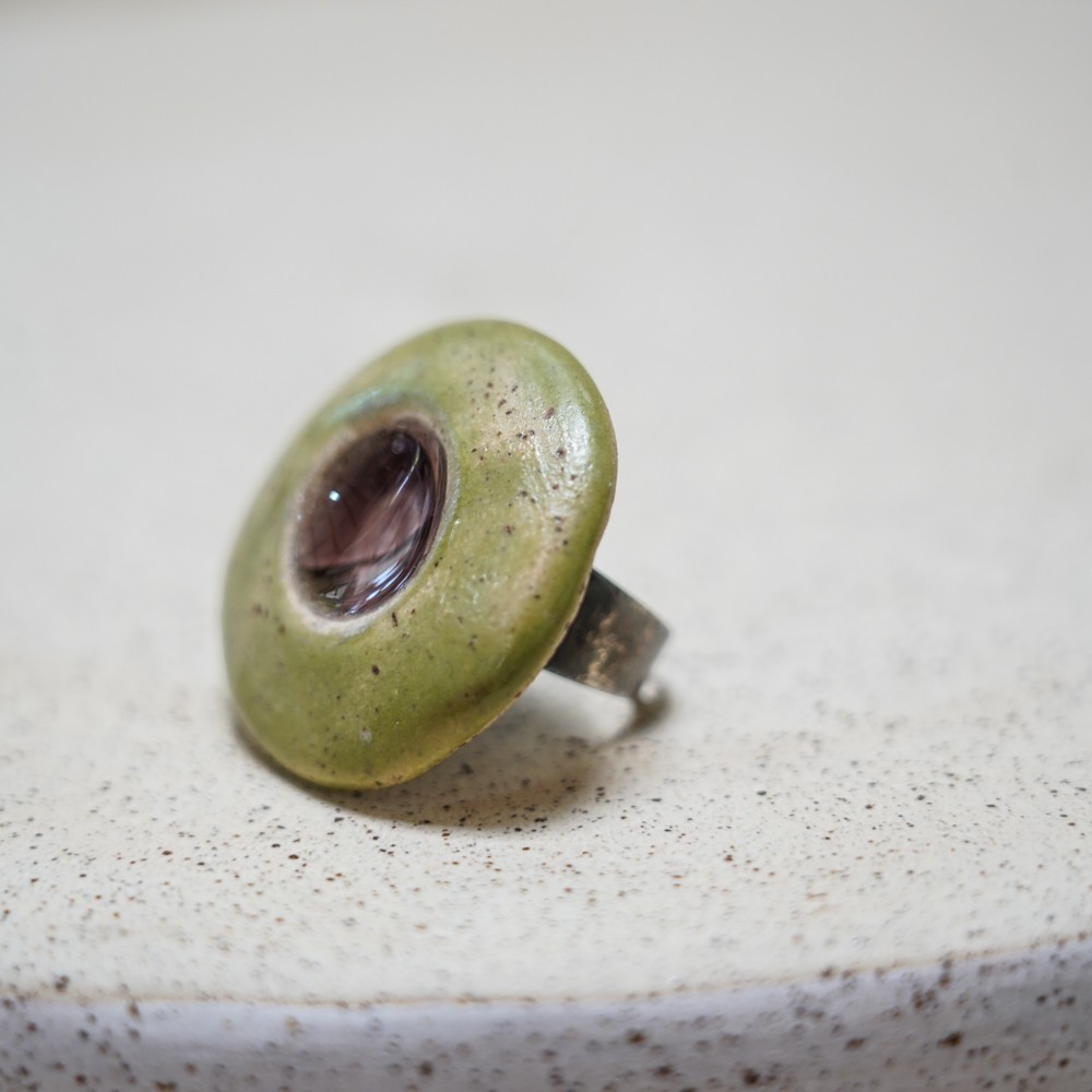 A handmade ceramic ring featuring a smooth oval form, finished in an olive green glaze with a deep, dark glass centre. The glossy glass element sinks naturally into the ceramic surface during firing, creating a sense of depth and contrast against the earthy green tones. Each ring is kiln-fired and carries subtle variations that make it truly one of a kind.