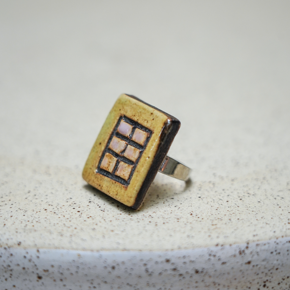 A handmade ceramic ring featuring a rectangular element with a geometric grid motif. Warm earthy glaze tones are contrasted by bold black lines, creating a structured yet organic composition that highlights the handmade character of the piece.