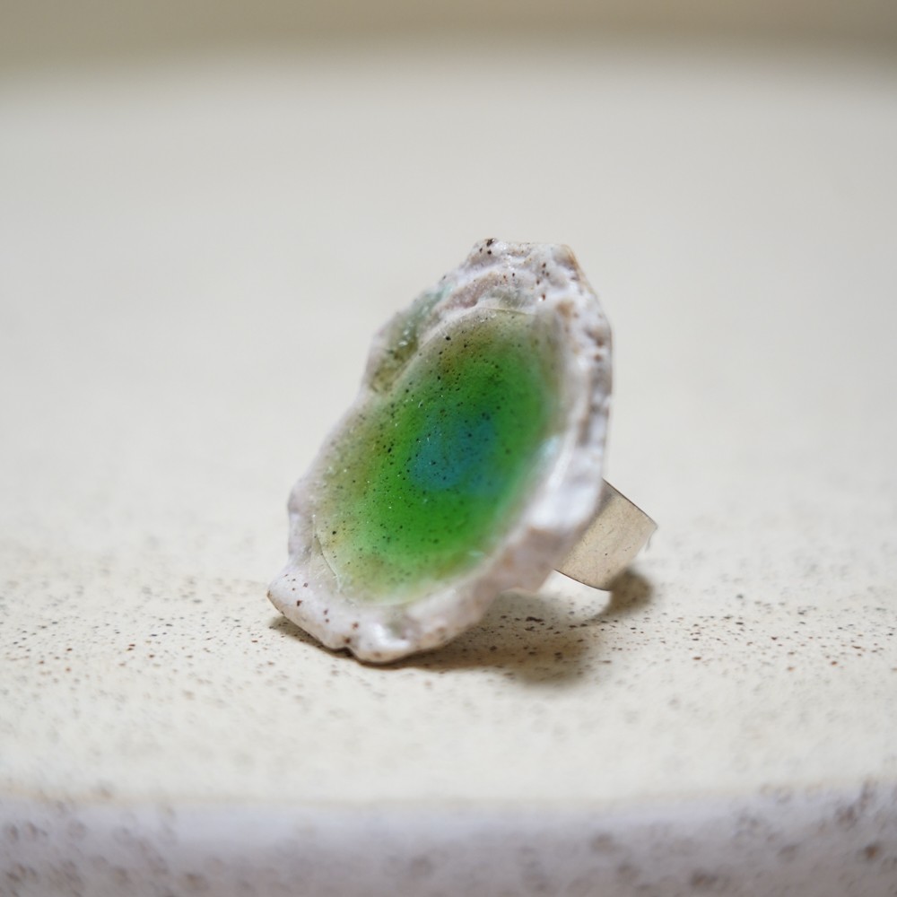 A handmade ceramic ring featuring an organic white ceramic form with a vivid green–blue glass centre. The glass surface melts naturally into the ceramic during firing, creating soft colour transitions and depth, while the irregular ceramic edge enhances the raw, natural character of the piece. Each ring is uniquely shaped and kiln-fired, making it truly one of a kind.