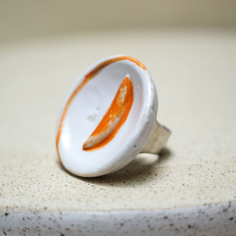 A handmade ceramic ring featuring an oval element with a sculpted inner curve. A soft white glaze frames a vivid orange accent, creating a calm yet expressive contrast inspired by organic forms and subtle movement.