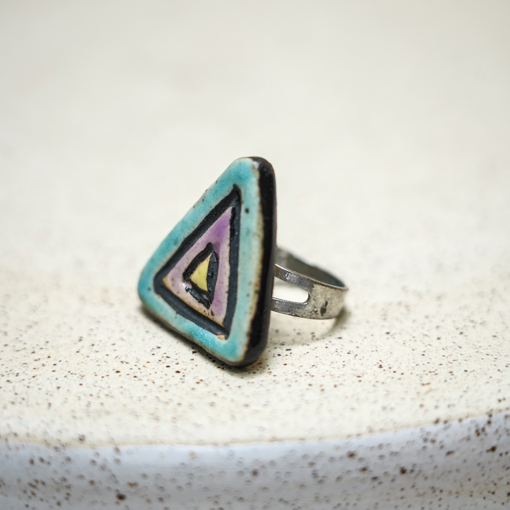 A handmade ceramic ring featuring a distinctive triangular shape with a layered geometric glaze pattern. The ceramic element combines turquoise, lilac and soft yellow tones outlined with darker accents, creating depth and a strong visual focus. Each ring is individually crafted and mounted on an adjustable metal band, making every piece truly unique.