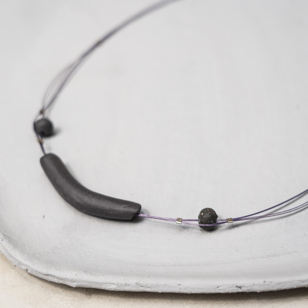 This wire necklace combines a gently curved matte black ceramic element with a small textured ceramic bead threaded onto fine violet-toned wire. The interplay between the elongated curve and the granular surface detail introduces rhythm and contrast within a lightweight, contemporary composition.