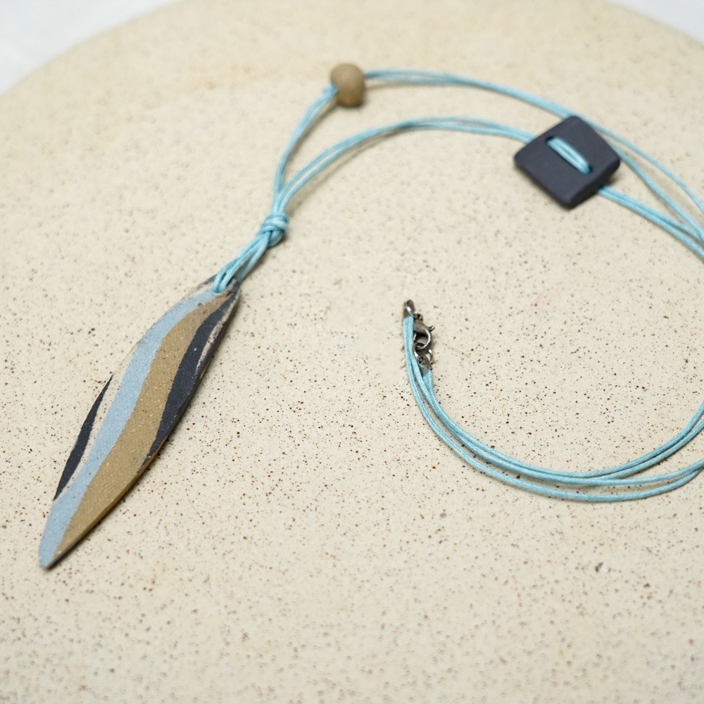 This waxthread necklace features an elongated ceramic element shaped like a slender leaf, finished in layered blue, sand and charcoal tones. The soft turquoise waxed threads enhance the organic colour palette, while a small natural ceramic bead and an adjustable closure complete the design. A lightweight piece that balances movement, texture and calm geometry.