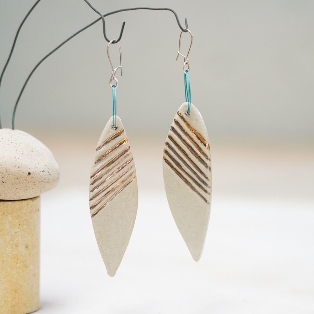 These wire earrings feature elongated porcelain elements accented with fine gold lines. The slim silhouette and subtle metallic detail create a refined contrast between softness and precision, giving the earrings a quiet yet elegant presence.