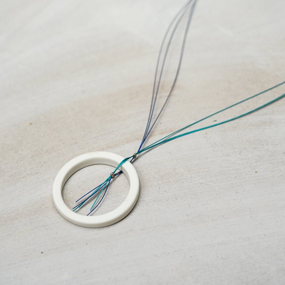 This jewelry wire necklace features a smooth ivory ceramic open circle suspended on fine, multi-toned wires. The clean geometry and neutral ceramic surface create a calm and balanced composition, while the delicate wires introduce light movement and subtle colour contrast.