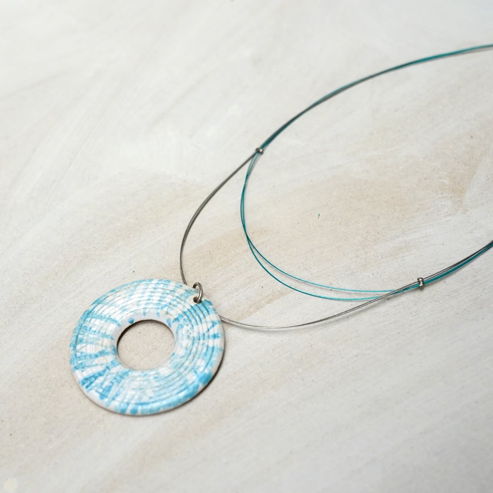 This jewelry wire necklace features a textured circular ceramic element with a central opening, creating a light and airy composition. The subtle blue markings on the ceramic surface introduce a sense of movement, while the fine wire construction keeps the overall design delicate and contemporary. The result is a necklace that feels calm, balanced and visually refined.