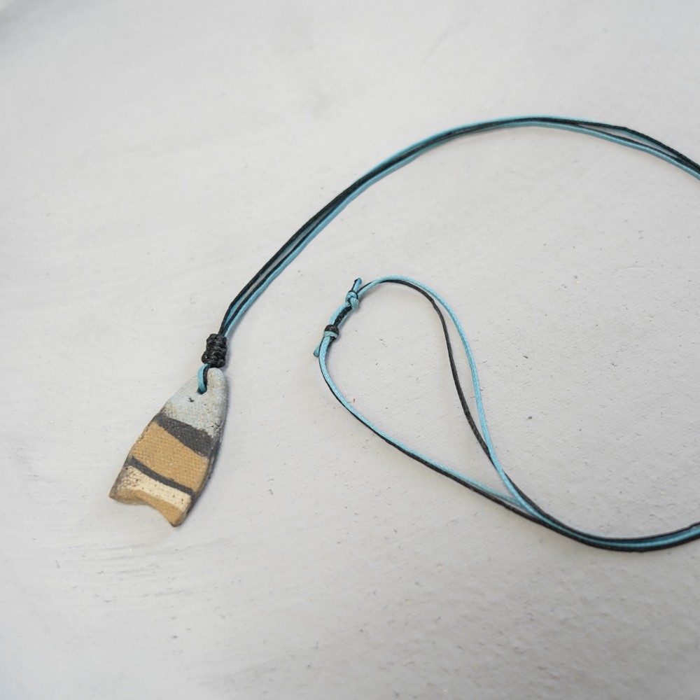 The ceramic fragment is shaped and finished entirely by hand. Layered slips are applied before firing, allowing the bands to settle organically during the kiln process. Each firing creates subtle variations in colour and texture, ensuring that no two necklaces are exactly alike. The waxed threads are assembled and knotted by hand for durability and comfort.
