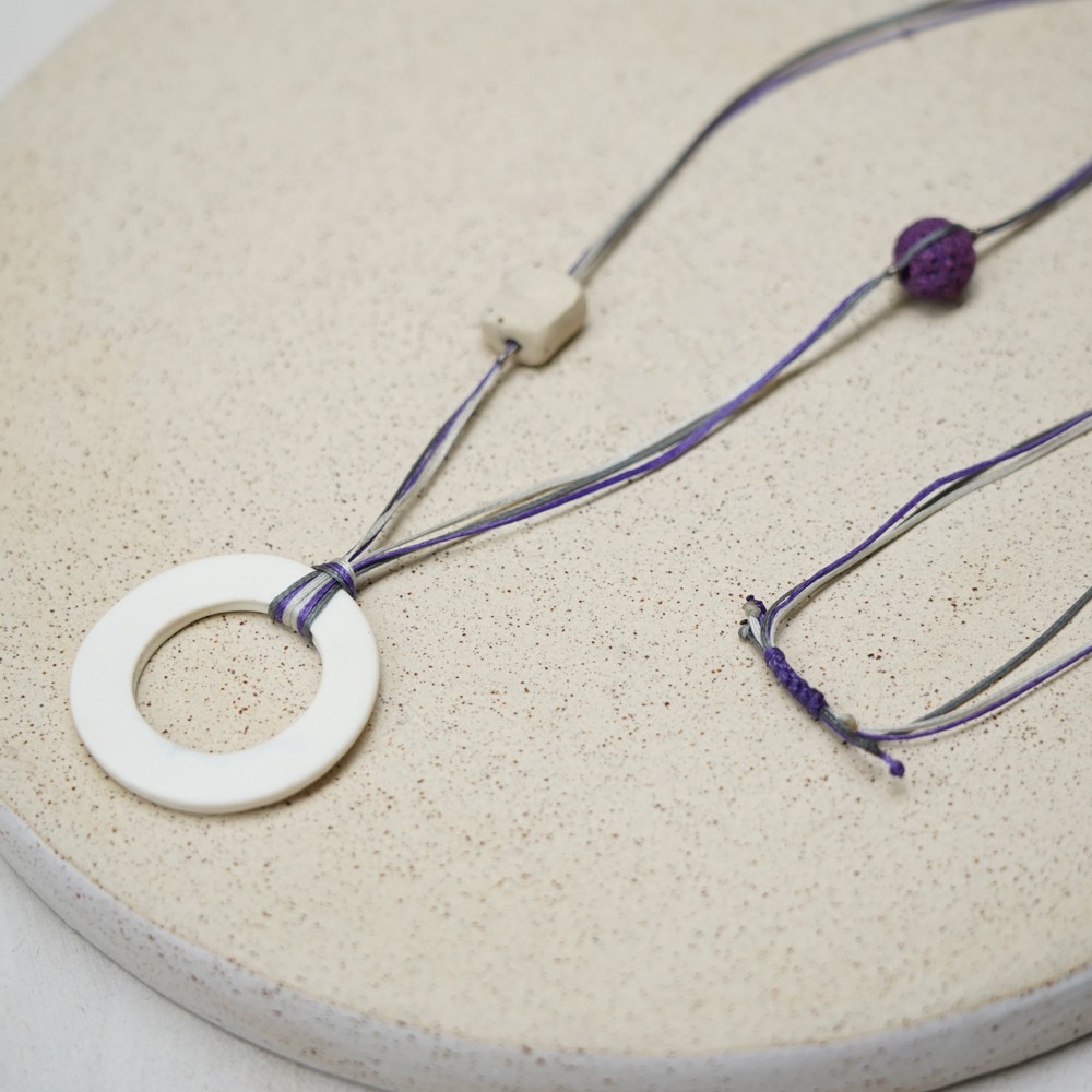 This necklace pairs effortlessly with neutral outfits, linen fabrics and relaxed silhouettes. The white ceramic ring creates a clean focal point, while the purple and grey thread tones introduce a soft colour accent without overwhelming the look.