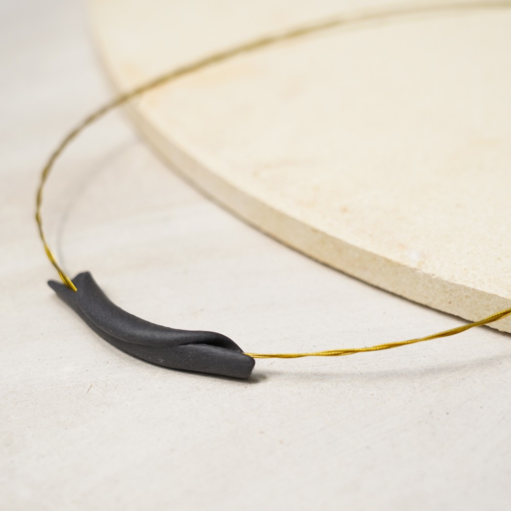This wire necklace features a sculpted ceramic element with a soft, curved profile and a matte black finish. The ceramic form rests lightly on fine gold-toned wire, creating a minimal composition that balances movement, tension and organic flow.