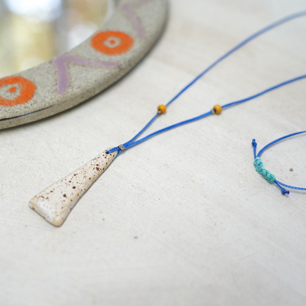 The slender ceramic form and bright blue thread make this pendant easy to style with neutral or summer-toned outfits. It works equally well layered or worn alone as a subtle handmade statement.