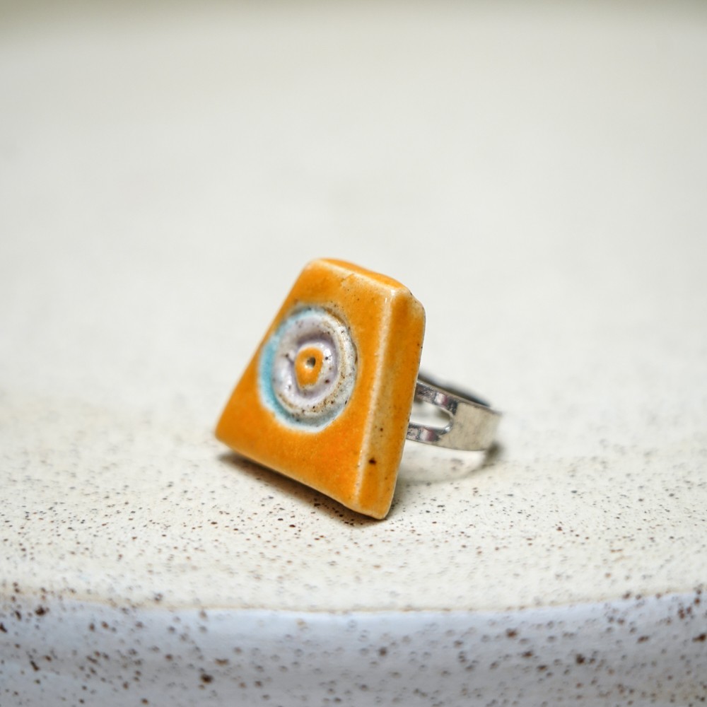 A handmade ceramic ring featuring a square ceramic element with a central concentric circular motif. The warm orange surface frames a layered circular detail in white and pale blue tones, creating a balanced contrast between geometry and organic texture. Each ring is individually crafted and mounted on an adjustable metal band, making every piece truly one of a kind.