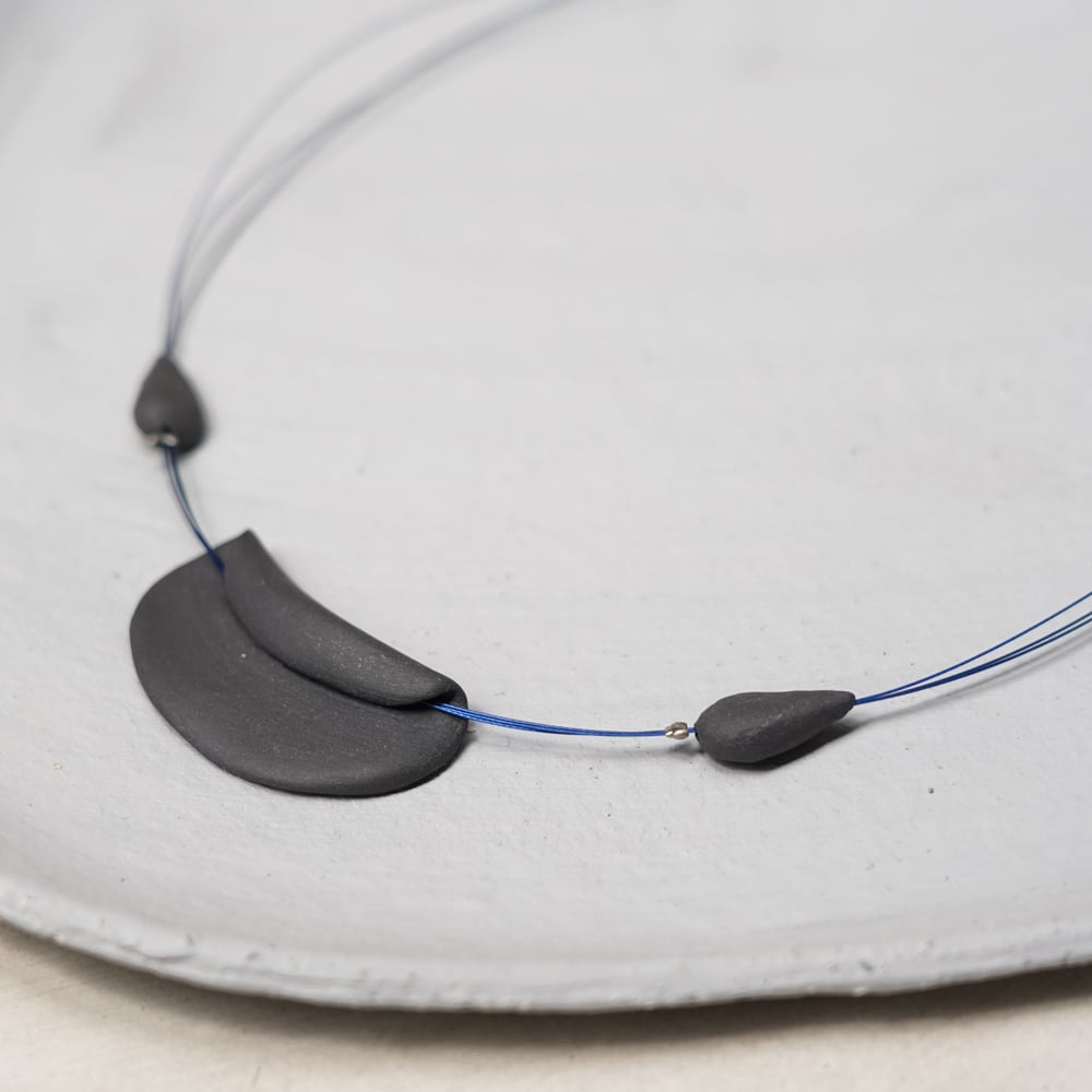 We individually shape and finish each ceramic arc by hand, creating natural variations in thickness, curve and surface texture. We carefully assemble the wire to ensure smooth movement, durability and balance, making every necklace truly unique.