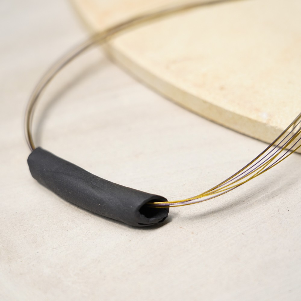 This wire necklace features a straight, elongated ceramic tube finished in matte black and threaded on fine multitone wire in subtle gold and violet tones. The clean cylindrical form creates a restrained linear composition that highlights material contrast, balance and quiet movement.