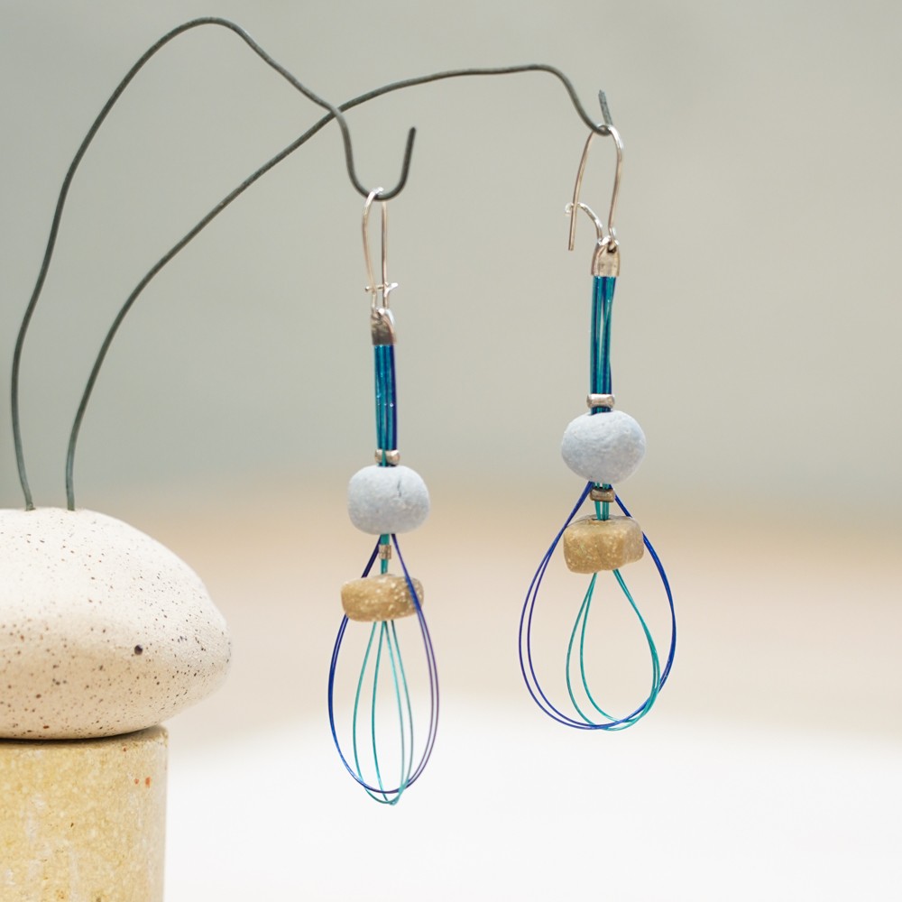 These wire earrings feature a vertical composition of three ceramic beads combined with fine, flexible wire lines. The colours shift subtly as the earrings move. At the same time, the layered wires create a sense of lightness and flow. As a result, the piece feels balanced, expressive and easy to wear.