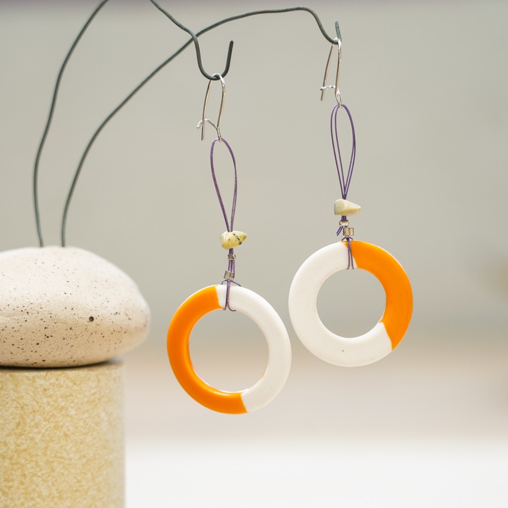 These wire earrings feature a circular porcelain element with a clear two-tone finish. The contrast feels playful yet balanced. At the same time, the open circle keeps the design light and airy. As a result, the earrings move freely and sit comfortably on the ear.