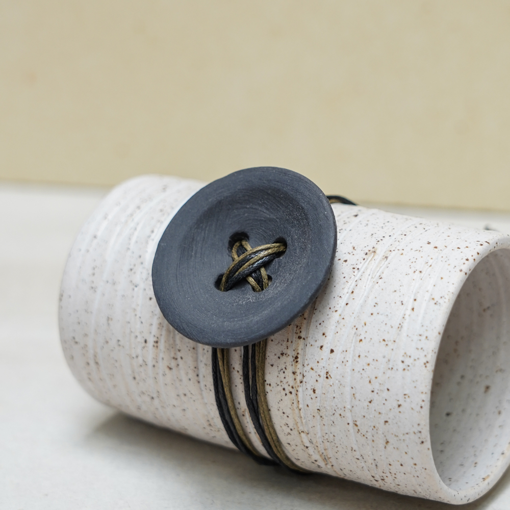 This handmade bracelet features a black porcelain button-shaped element combined with earth-toned waxthread. The flat ceramic disc and its subtle surface marks create a quiet, organic character inspired by natural materials and tactile forms.