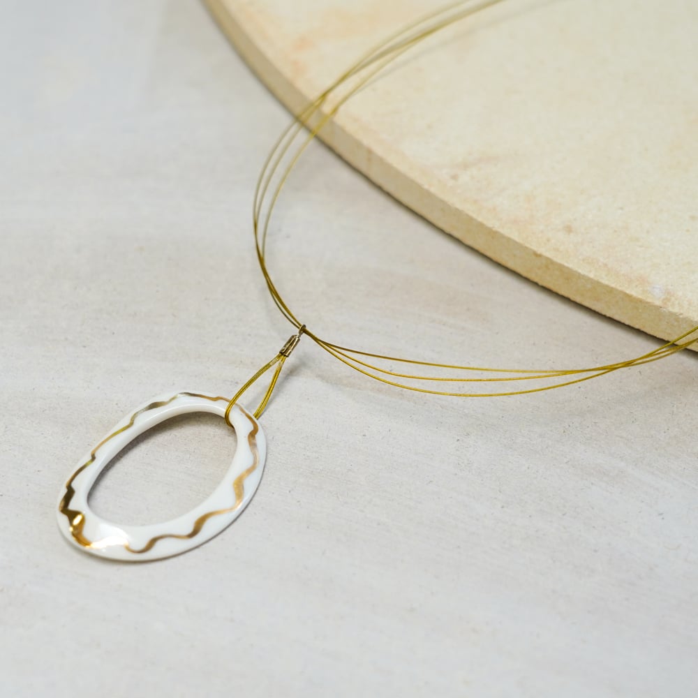 The ceramic ring is shaped and glazed by hand. The gold detailing is applied manually, following the natural flow of the oval form and creating subtle variations that ensure every necklace remains unique.